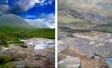 I based this picture on some photographs I took in Glencoe. I has some reservations with the original photograph so I managed to piece together the image on the left (using another sky cropped from a picture) and used it as my reference material for the picture. As a result the painting is not a faithful reproduction of the original photos - the sky evolved slightly differently and I also added greater contrasts on the land for a more dramatic effect of the sun hitting off the lower slopes.